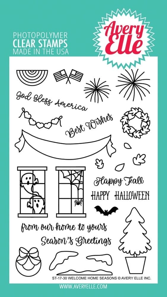 Our Welcome Home Seasons stamp set coordinates with our Welcome Home stamp & die set (ST-17-25 & D-17-25). Decorate the house for any holiday or season, such as 4th of July, Valentine’s Day, Halloween, or Christmas. 25 total stamps. Banner measures: 2 3/4″ x 3/4″; Flags measures: 13/16″ x 3/8″; from our home to yours sentiment measures: 2 5/16” x 1/4”. Our Exclusive clear stamps are proudly made in the USA.