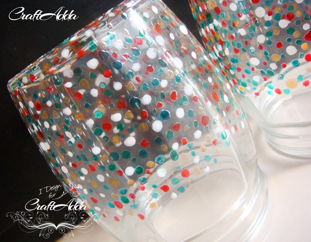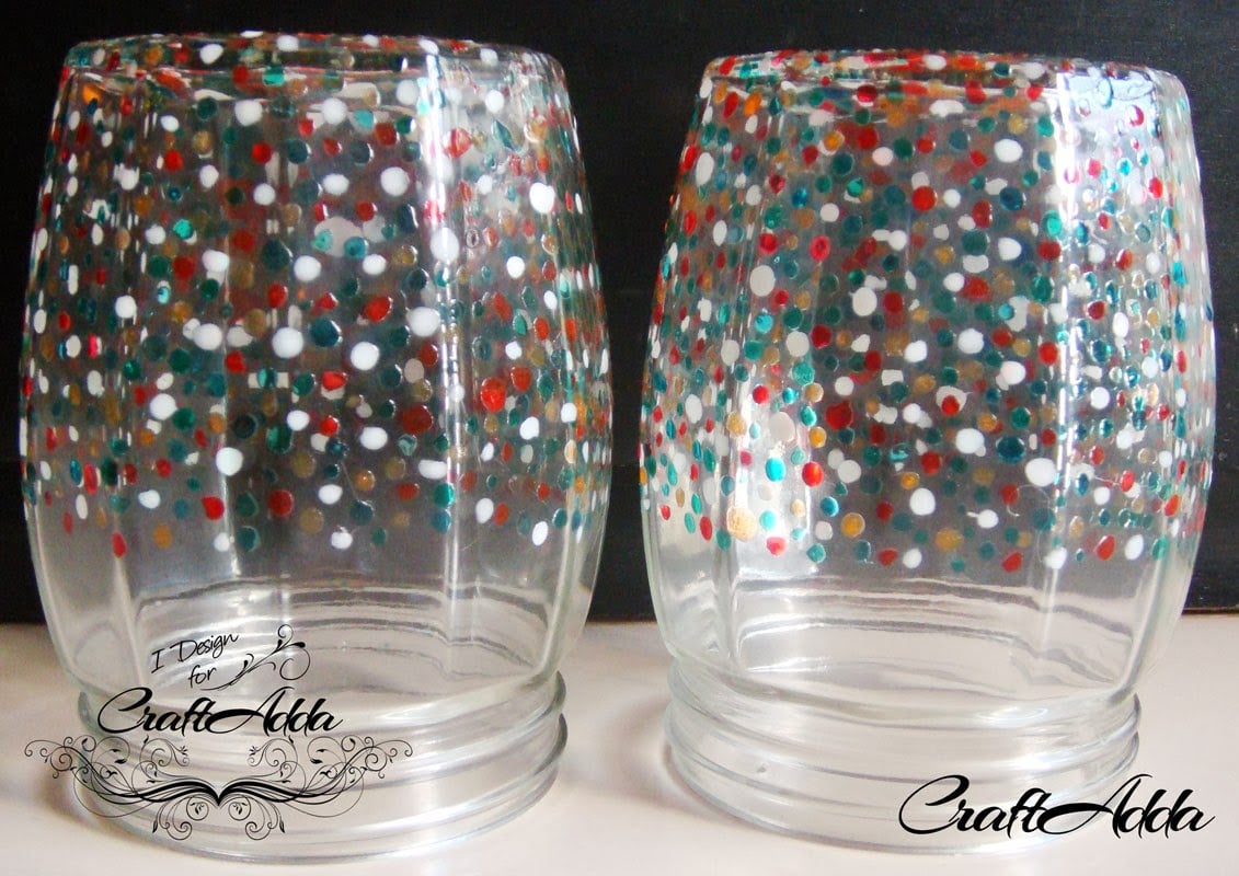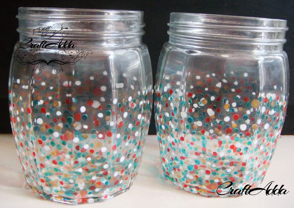 Hello Crafters out there its Khyati back again with a non paper craft project.. This time its another altered project.. I altered a set of bottles used in Kitchen simply because they were too plain for my taste :).. I really wanted to try my hands on hand painting and then adding colors using glass paint… Being impatient me I went to market without any research and bought some paints.. Alas when I came home I realized those were Glass Water soluble paints and hence I had to improvise as I wanted to color the jars which would be washed weekly if not daily.. I googled up a lot and realized that nail varnish is a good alternative to glass paint as they aren’t water soluble.. Hence I got some clear nail paints and added some photo colors to them to get Jelly looking nail paints and started adding confetti’s to my jars randomly.. So here are the pictures for the same –