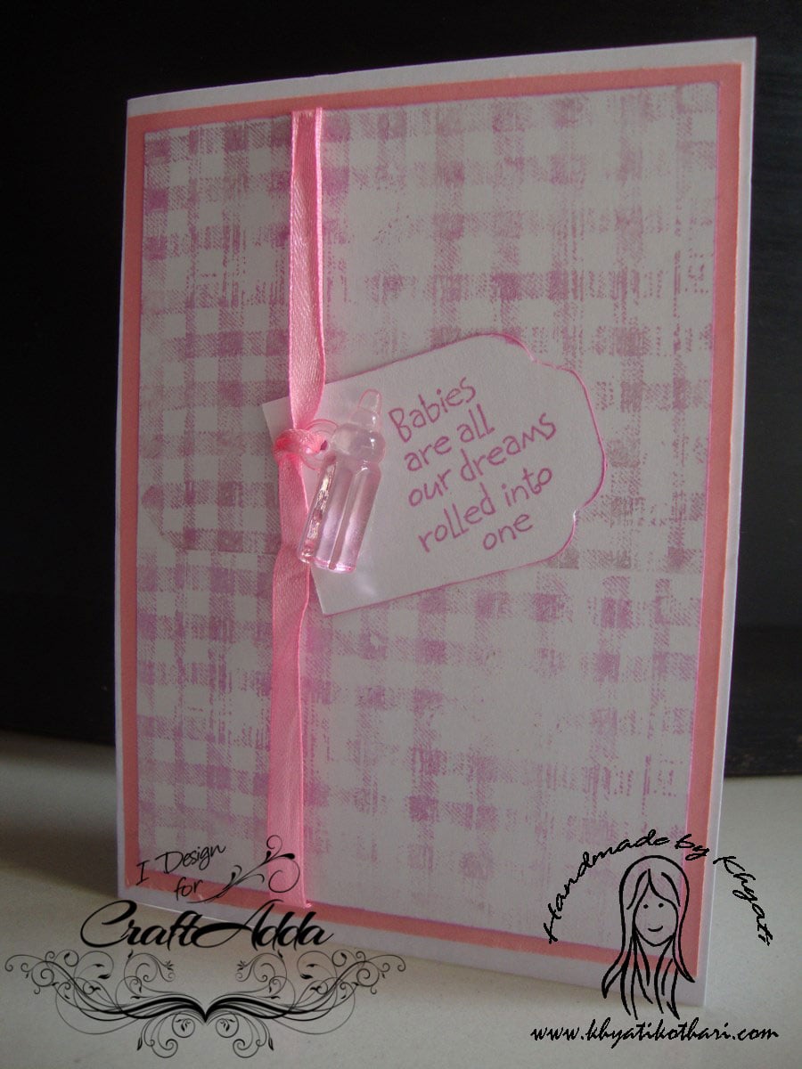 The baby sentiment stamp is something which I had ordered from Lily of the Valley as soon as I realized my sister in law was pregnant.. I had used this stamp in 2 3 cards and then it was just sitting in the corner.. This time I made a pact to used my stamps which I haven’t used since long time… And this is one of the many cards of the series š .. The cute pink baby bottle is a buy from CraftAdda.. They have the most amazing collection of baby embellishments perfect for scrapbooking projects and man do I love it š