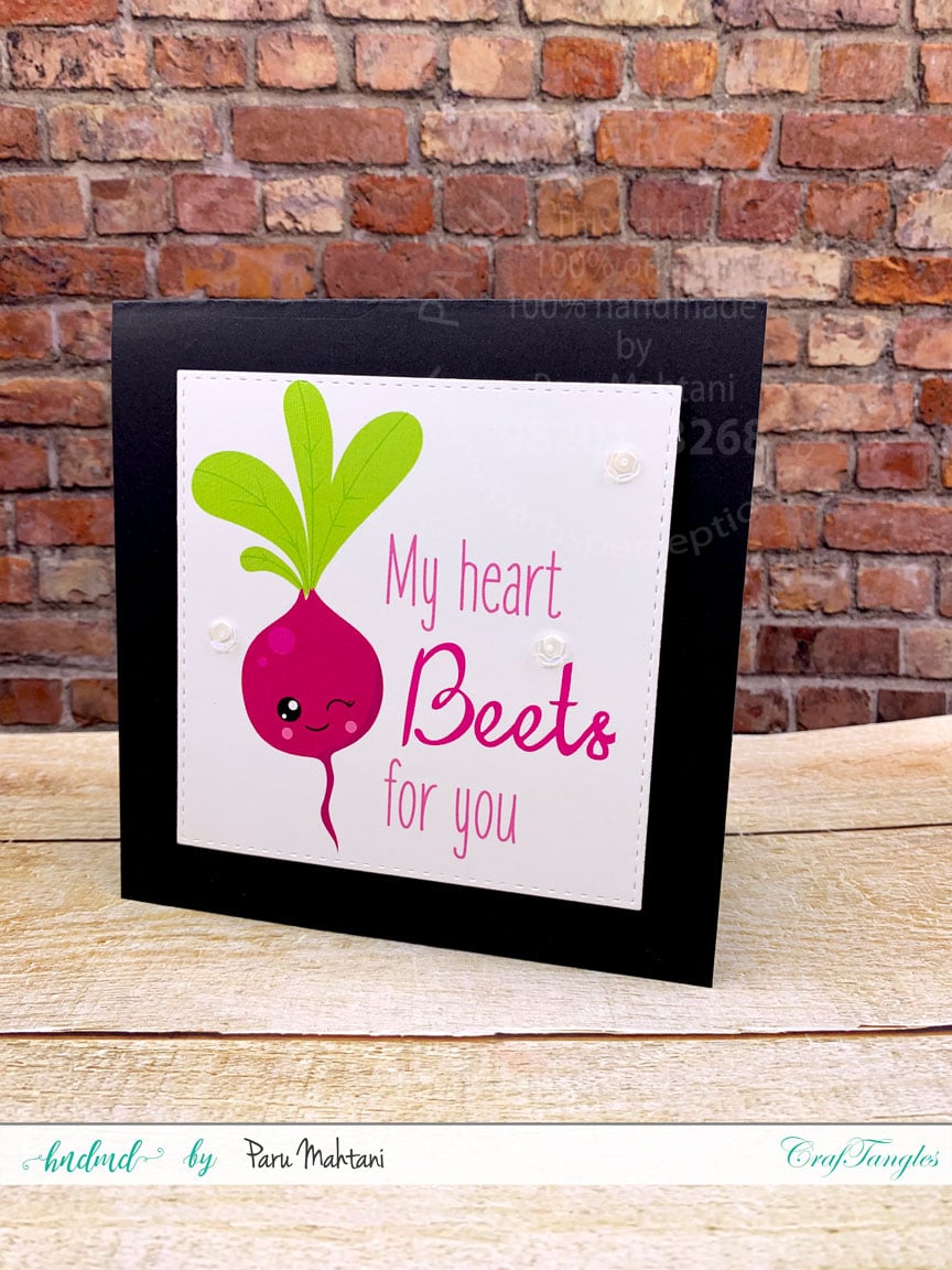 I die cut the cute image from the Craftangles Elements Pack, Sweet Love 2 using a stitched square die and adhered it to a 5″x5″ folded card make out of Craftangles Black card stock.