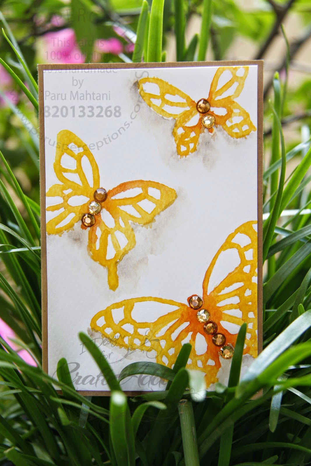 For the first card, I did a light watercolour wash around the butterflies in grey, popped on some gemstones and mounted the panel onto a silver card base.
