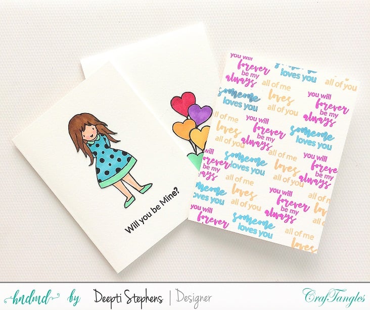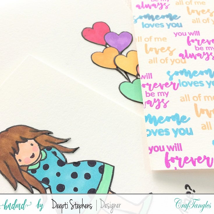I started by stamping the girl image on white card stock and colored her with Markers. I partially fussy cut the balloons and added dots to her dress for some extra interest. Then I adhered the image over the main card base and finished it with a sentiment.