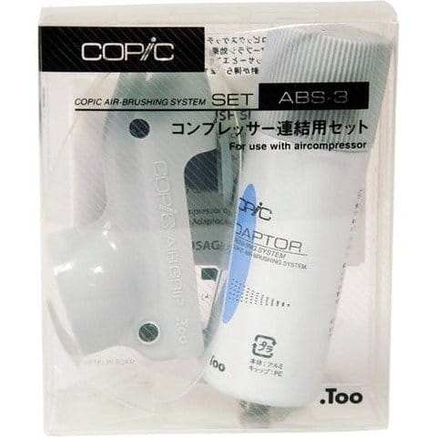 The Copic ABS-3 kit includes the Air Grip and Air Adaptor and is meant for use with the Air Can 180 or an air compressor. This kit is ideal if you already own an air compressor or as a replacement for ABS1-N parts. Please note that this kit requires the 1/4″ to 1/8″ hose for use with the Air Can 180, and the 1/4″ to 1/4″ for use with an air compressor.