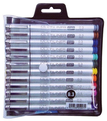 This set contains all 12 Multiliner SP colors in a 0.3mm replaceable nib: Red, Purple, Pink, Wine, Sepia, Orange, Yellow, Turquoise, Olive, Sky Blue, Cobalt, Cool Gray