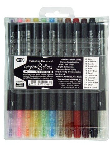 The atyou Spica Glitter pens add sparkle and texture to any project. The glitter is achieved by the use of micro glass flakes, which are more reflective than glass beads used by other brands. The pigment is transparent, so it can be used over other ink