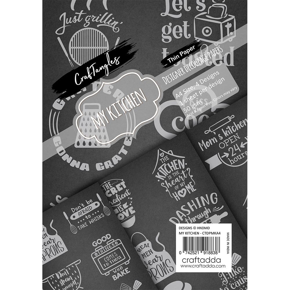The decoupage paper pack was designed with a focus on kitchen quotes on the chalkboard theme. The designs are ideal for all your decoupage projects wherein you wish to have a bold black colour with a kitchen related quotes