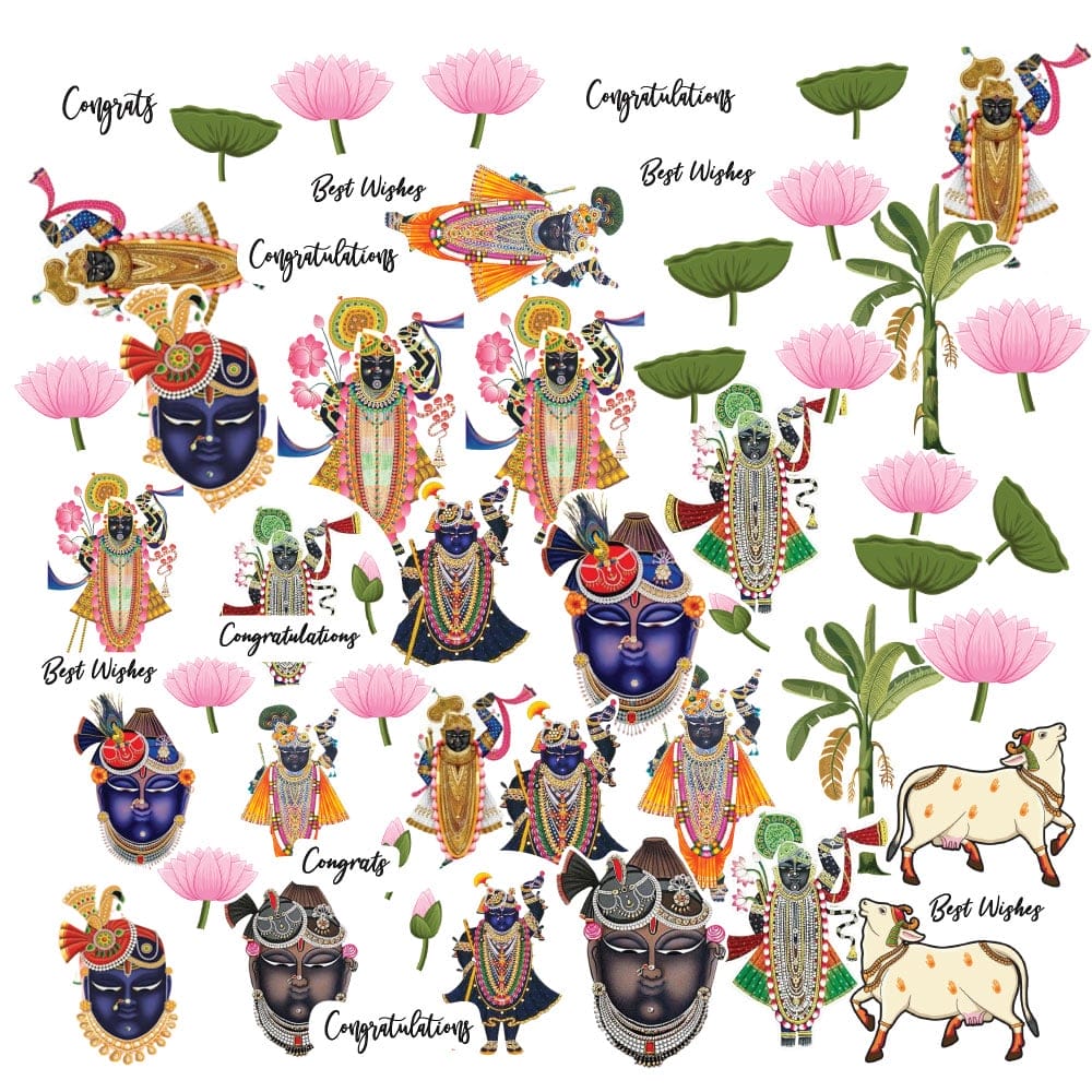 This package includes 56 beautifully crafted die-cut pieces featuring different Shreenathji images with lots of lotus flowers, leaves and coordinated sentiments for various occasions