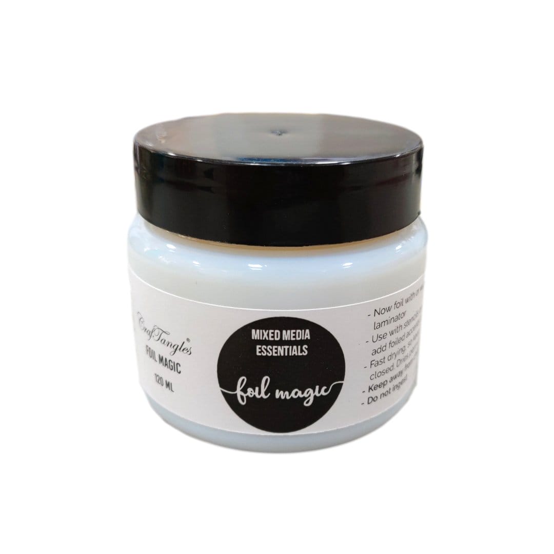 CrafTangles Foil Magic is a tacky acrylic medium, it looks milky but dries crystal clear and when dries remain tacky so can be used with stencils, stamps or even freehand with brushes to add foiled accents on your projects. It sticks to Metal, Glass, plastic, chipboard, paper, canvas etc and is permanent once dry.