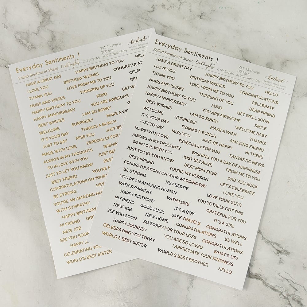 A pack contains 2 sheets of A5 element pack, Sentiment is gold foiled on top of white background.