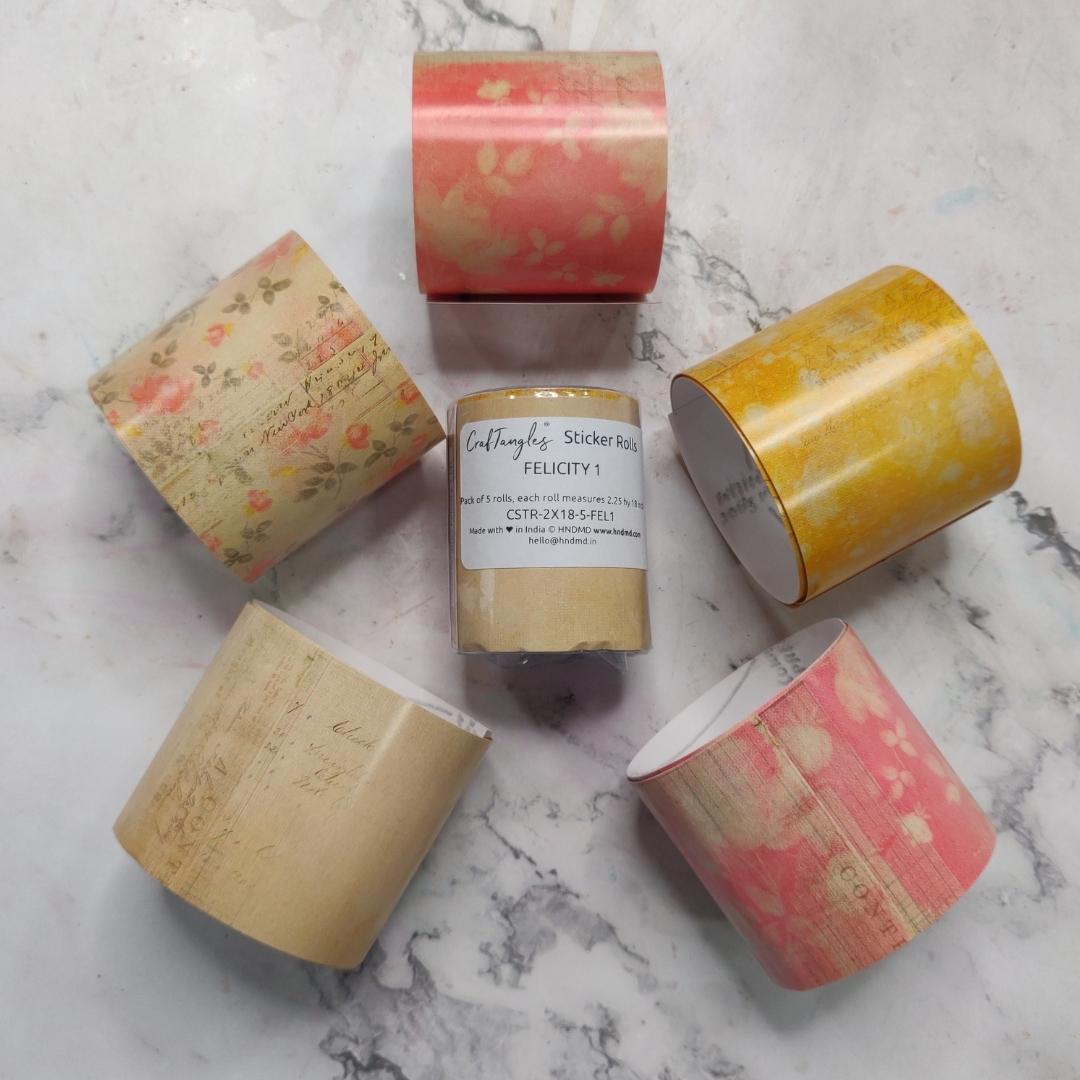 A pack contains 5 rolls of 2.25 by 18 inches sticker each of the designs as shown in the image.