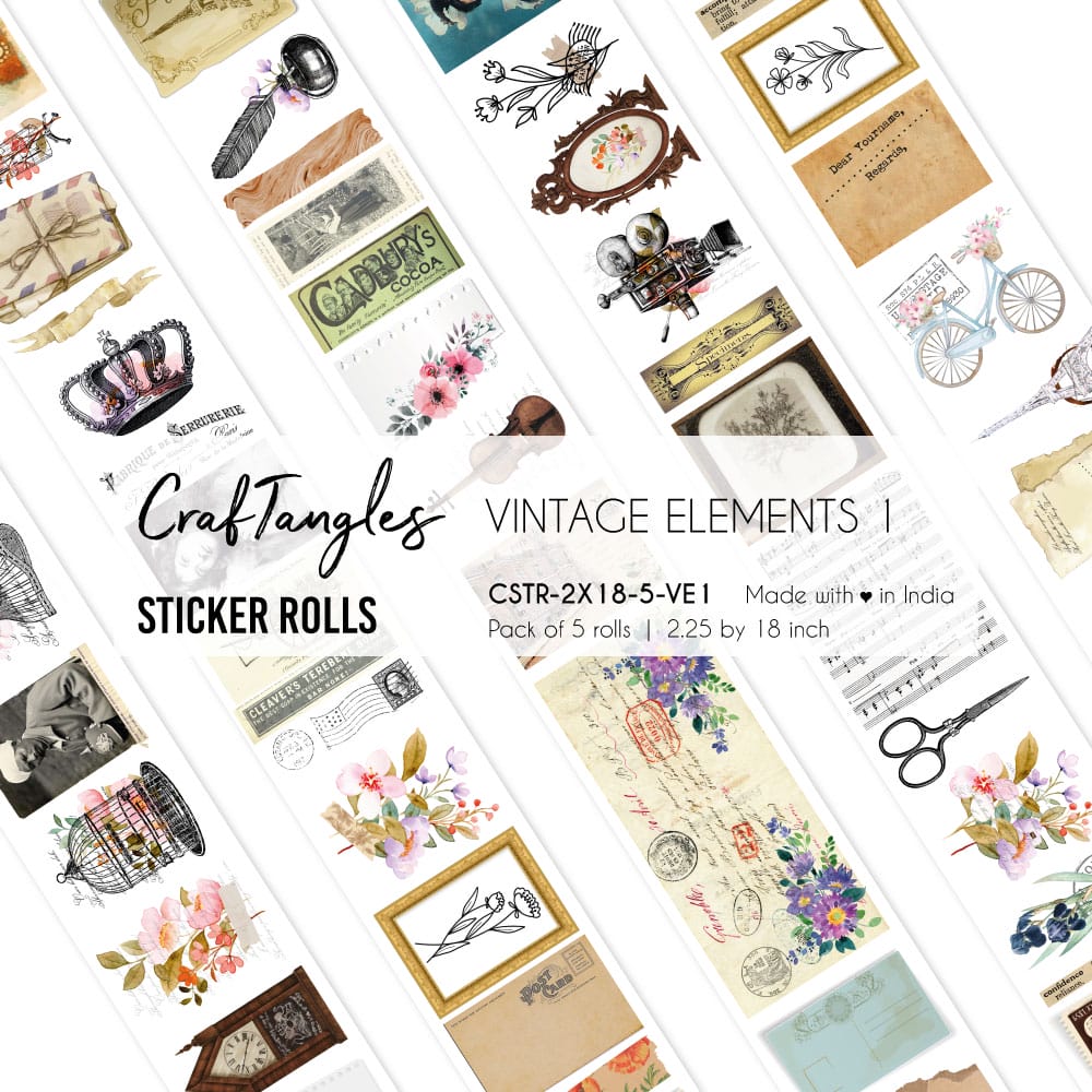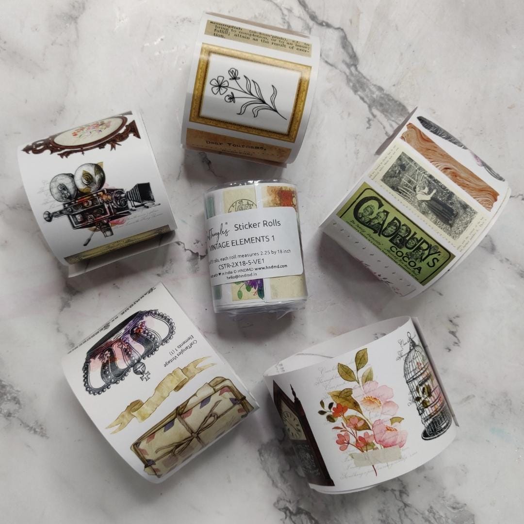 A pack contains 5 rolls of 2.25 by 18 inches sticker each of the designs as shown in the image.