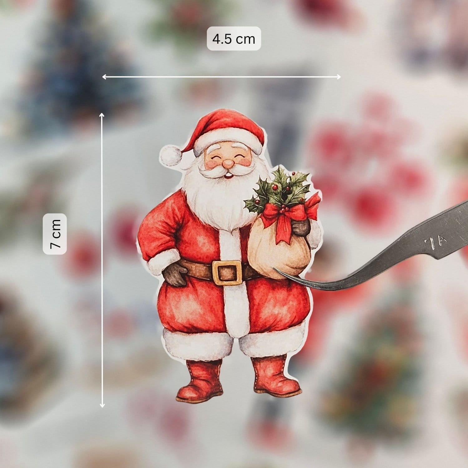 For reference, santa from the sticker pack measures approximately 4.5 cm by 7 cm as shown in the second image