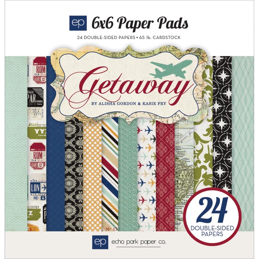 ECHO PARK PAPER-Getaway Cardstock Pad. A great addition to your scrapbooking projects! This package contains twenty-four 6×6 inch double-sided sheets in six different designs (four of each design). Acid-free and lignin-free. Made in USA.