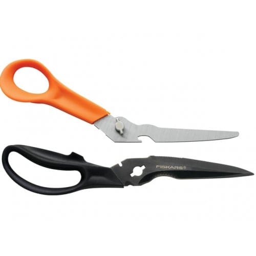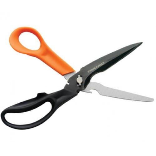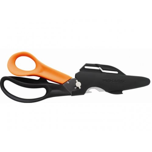 With the new Fiskars Cuts+More Multipurpose scissors you can take the blades apart and use it as a knife, open bottles, cut wires and twines. You can open taped boxes with the tape cutter in the sheath as well as sharpen your scissors with the sharpener.