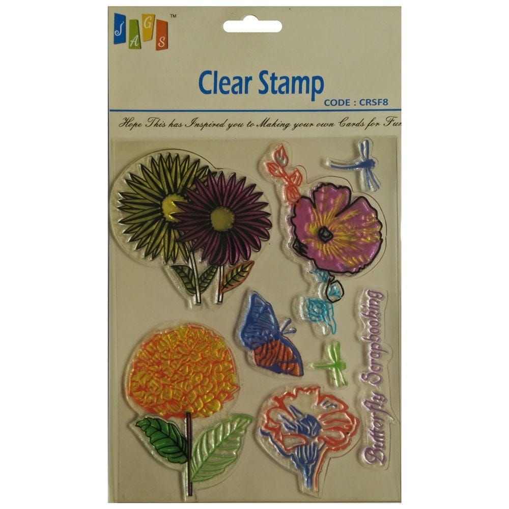 This 5.5 by 7 inch clear stamp set and contains 8 pieces of individual stamps.