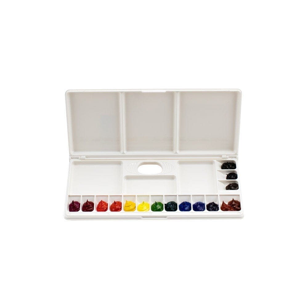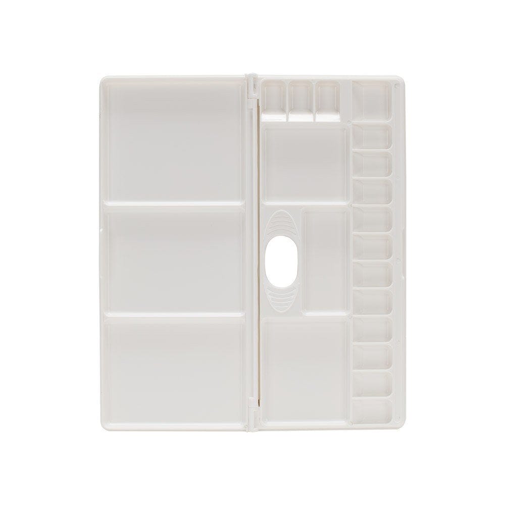 This high quality 10 by 4.5 by 0.75 inch folded size, plastic palette folds out into two sections. One section provides plenty of mixing area for watercolors, while the other provides plenty of wells to hold many colors. The folding plastic palette folds flat for table-top use and has thumb hole for holding. Its durable plastic body makes it perfect for painting and even traveling!