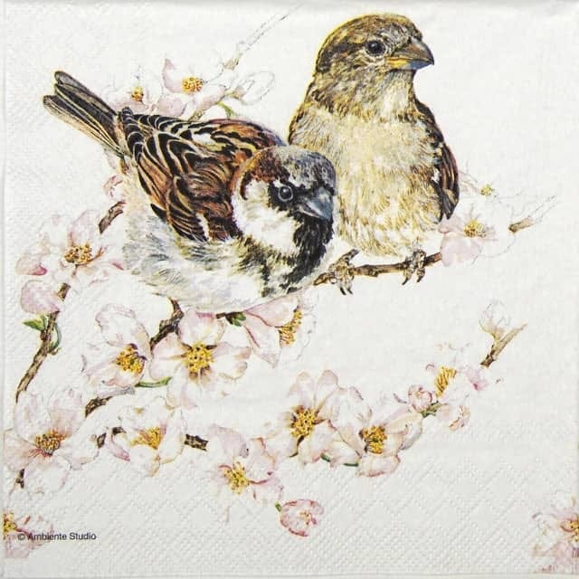 German Decoupage Napkins (5 pcs)  - Sparrows Blossom (Birds) German Decoupage Napkins (5 pcs) - Sparrows Blossom (Birds)