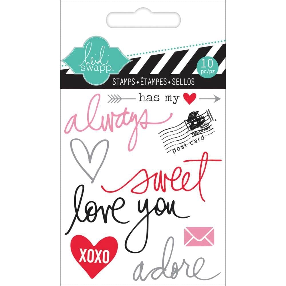 Heidi Swapp-Mixed Media Clear Mini Stamps. Stamp your projects with vibrant and fun designs! This package contains an assortment of mini clear stamps on one 3″X3.5″ backing sheet.