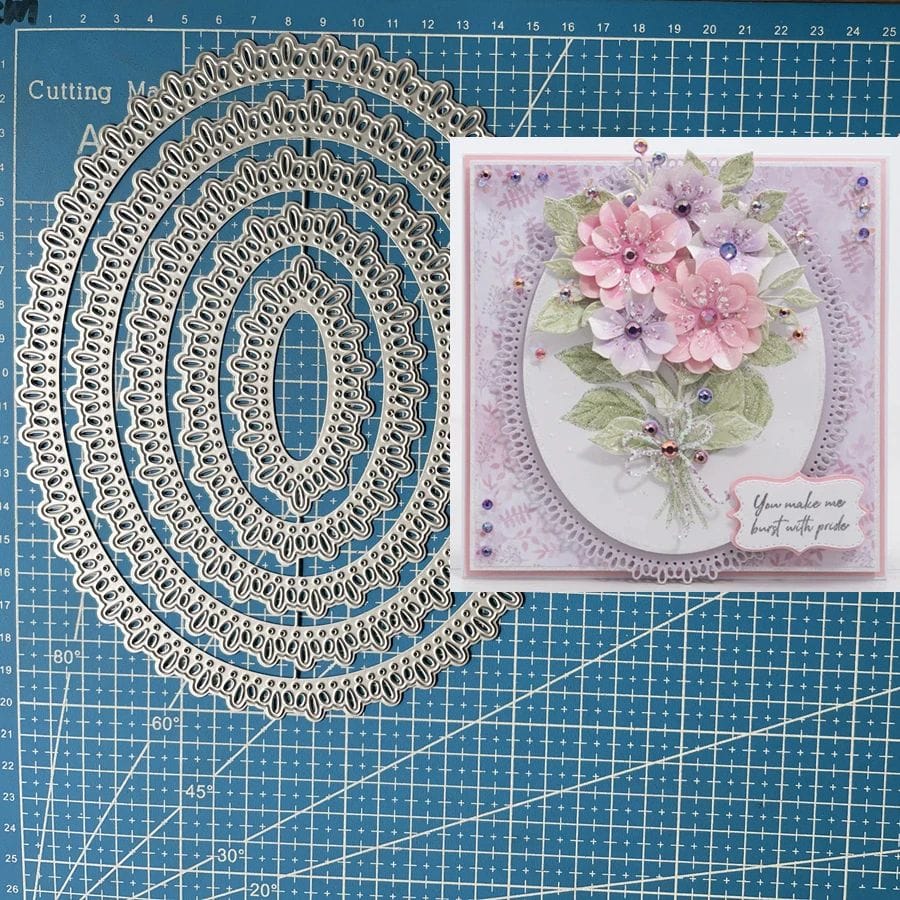These dies are compatible with large cutting machines A4 in size (used with a pair of Cutting Pads and the machine’s included Platform; when using the Essentials Platform or Solo Platform & Shim, the Extended Adapter or Solo Adapter is required). All items are sold separately.