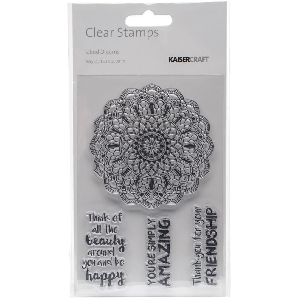 Kaisercraft-Clear Stamps. Clear stamps are an easy way to add inked images to paper crafting projects. Simply adhere them to any acrylic block, ink and stamp! This package contains Ubud Dreams: eight clear acrylic stamps on one 6×4 inch backing sheet. Photo friendly. Conforms to ASTM D 4236. Imported.