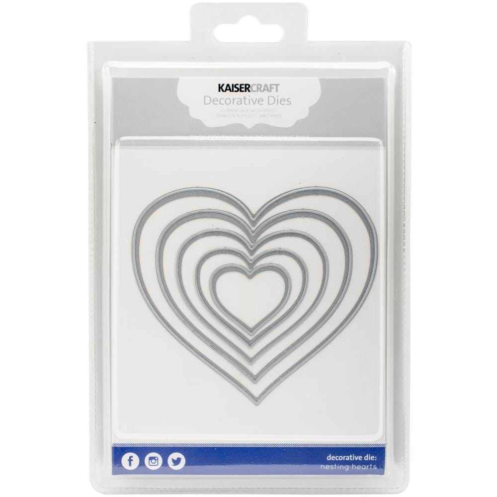 Kaisercraft-Nesting Dies. This steel dies will cut through cardstock, thin chipboard, felt, acetate, sticky back canvas, sandpaper, foam and much more! They work with virtually any die-cutting machine that will accommodate wafer-thin dies and are sure to become an essential ingredient in your paper crafting process. This 9×6 inch package contains Hearts: a set of five dies. Imported.