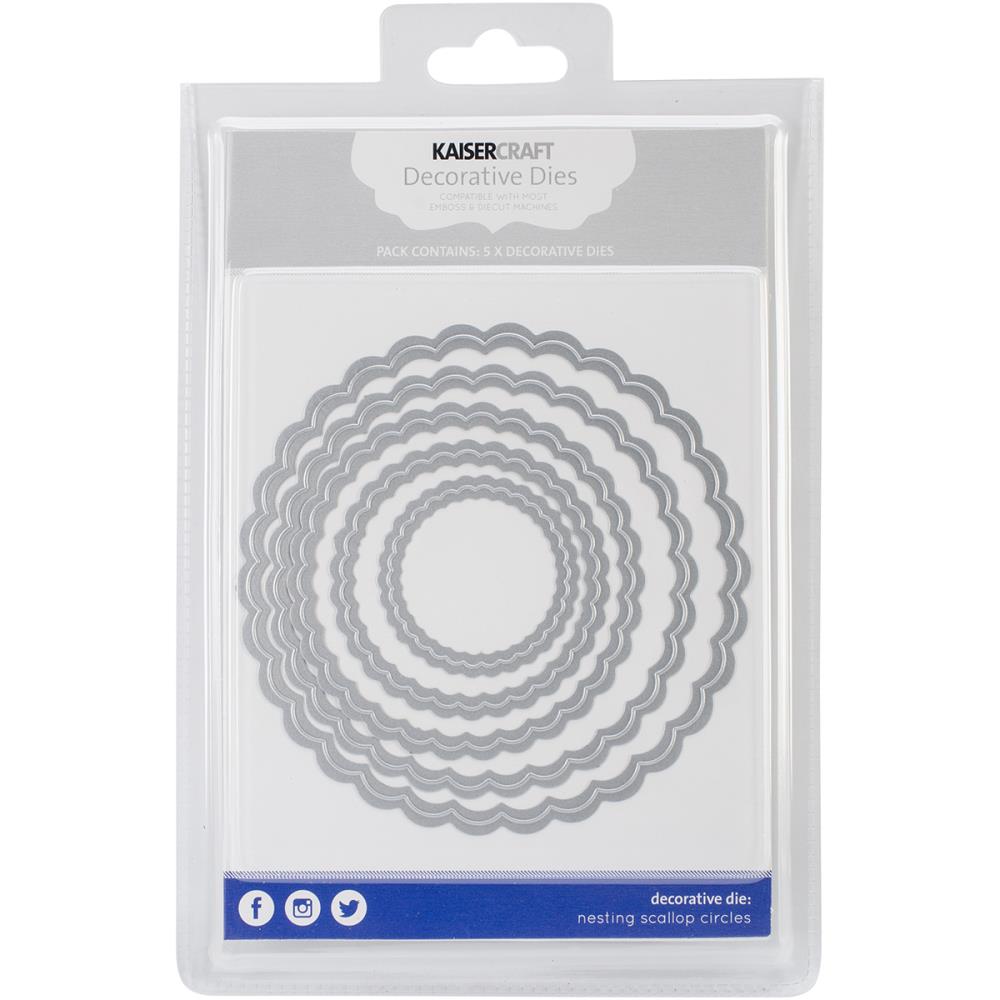 Kaisercraft-Die. This steel dies will cut through cardstock, thin chipboard, felt, acetate, sticky back canvas, sandpaper, foam and much more! They work with most emboss and die-cutting machines. This 9×6 inch package contains Nesting Scallop Circles: five dies. Imported.