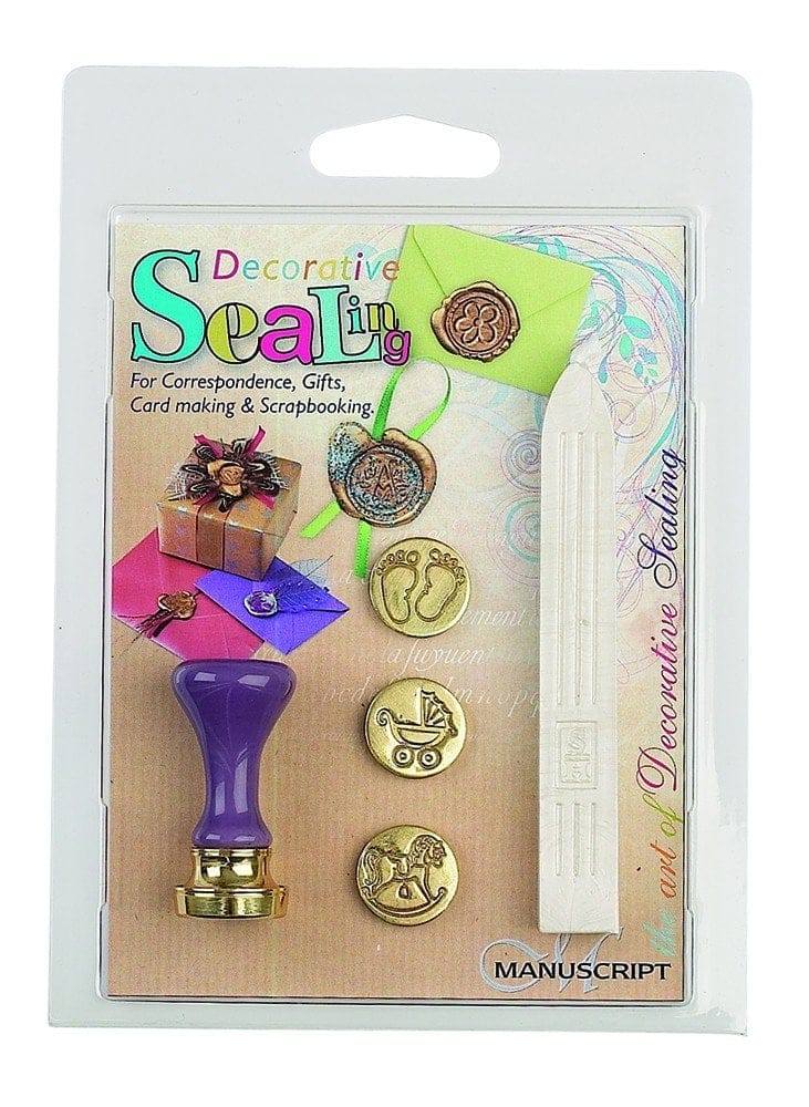 Manuscript’s Decorative Sealing 3 coin set offers you everything you need to get started…. A selection of 3 co-ordinating seal designs, an interchangeable handle and a stick of traditional style wick wax. Are you celebrating the arrival of new baby in the family or friends and looking to send a card or gift that has a personal touch? Why not add one of Manuscripts cutesy seal designs suitable for both girls and boys.