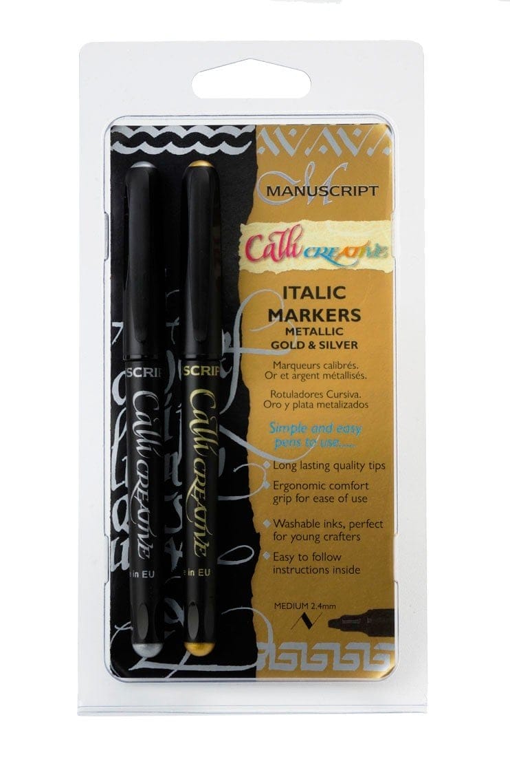 Manuscript’s best selling Metallic Gold & Silver Italic markers provide a touch of glitz and sparkle to any paper craft. The unique design ensures that the ink flows freely and consistently through the Italic fibre tip without the need to pump the metallic pigment through the pen.