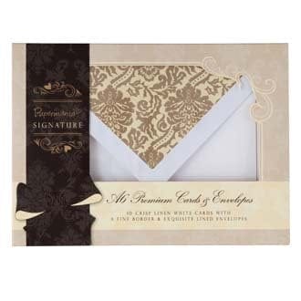 10 crisp linen white cards with a fine border & exquisite lined envelopes.