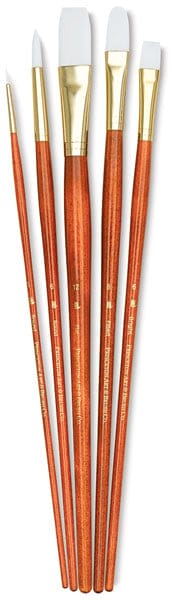 This synthetic White Taklon set contains five long handled brushes: Round 1 and 6, Bright 6, Filbert 8, and Flat 12. Use them for easel painting.