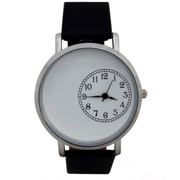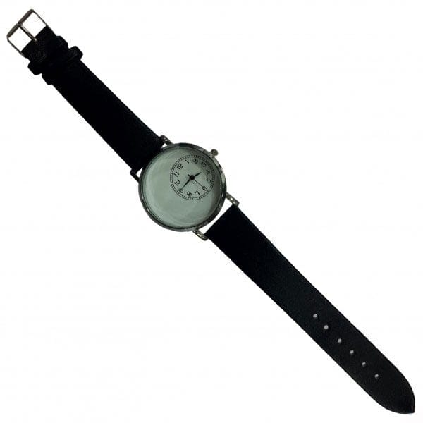 Wristwatch having round dial of 1-7/16″ diameter Black numeral ring. White Dials with large decorating area. Fits minimum wrist circumference of about 6″.