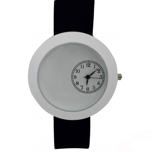 Wristwatch having round dial of 1-7/16″ diameter Black numeral ring. White Dials with large decorating area. Fits minimum wrist circumference of about 6″.