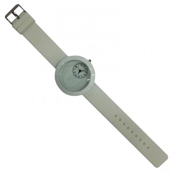 Wristwatch having round dial of 1-7/16″ diameter Black numeral ring. White Dials with large decorating area. Fits minimum wrist circumference of about 6″.