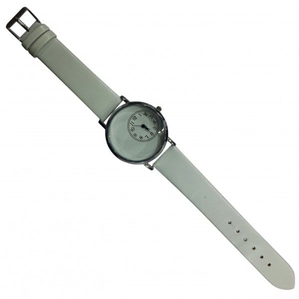 Wristwatch having round dial of 1-7/16″ diameter Black numeral ring. White Dials with large decorating area. Fits minimum wrist circumference of about 6″.
