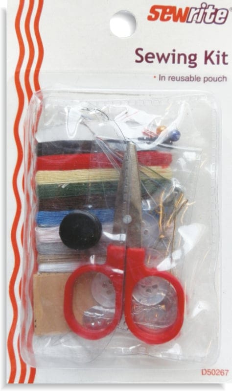 It includes 10 colors of thread, scissors, tape measure, pins, needles, needle threader, safety pins and buttons.