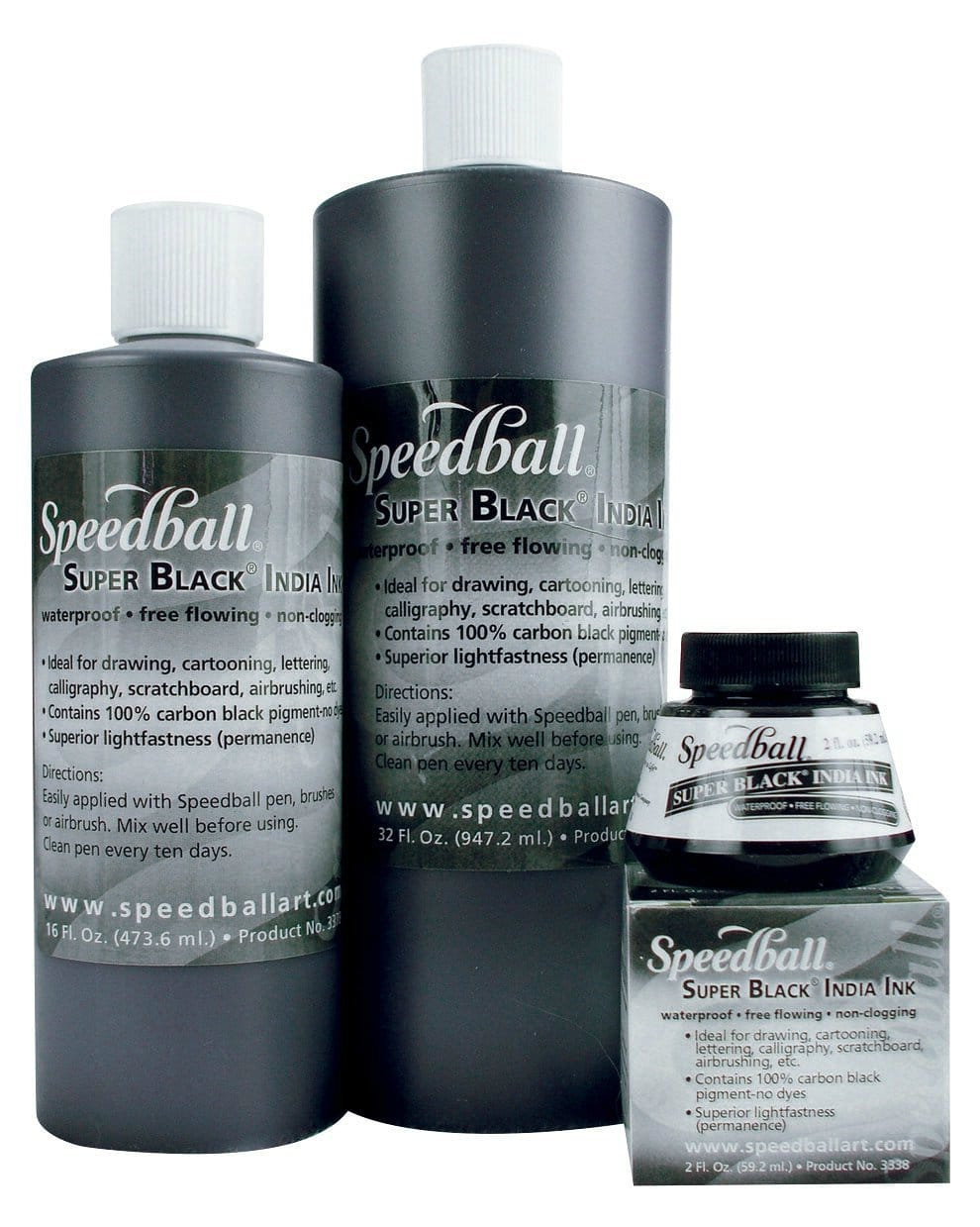 Speedball Super Black Waterproof India Ink is free-flowing, non-clogging, waterproof, permanent, fadeless, and contains 100% carbon black pigment.
