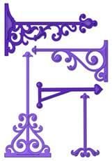 Five different sized posts from simple straight lines to ornate, wrought iron inspired, bearing hearts, fleurons and swirls. Perfect for elegant presentation of banners, pennants, labels and more! Attach horizontally to hang your insignia, or use vertically like a flagpole to display a design. Endless options for decorative display! These dies can be used with Cuttlebug / Sizzix / Big Shot/ Tim Holtz Vagabond machines.