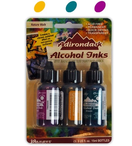 Tim Holtz Adirondack Alcohol inks create a polished stone & vibrant look. They are ideal for glossy papers, metal, foil, dominoes, plastic glass & other slick surfaces.