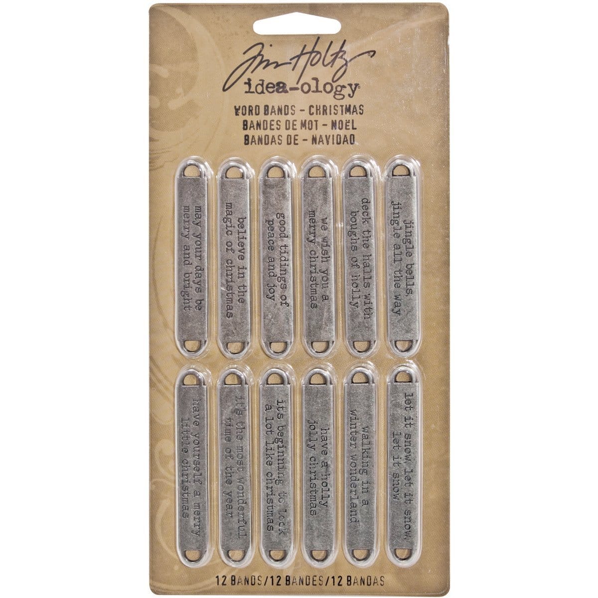 Twelve flat metal band connectors with inspirational Christmas themed quotes. They are stamped metal so the words are recessed to fill with paint or ink.