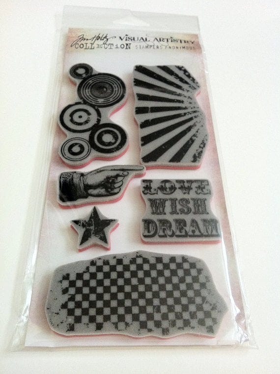 Embark on your artisitic journey with this collection of clear stamps from designer Tim Holtz. Simply peel stamp from clear backer sheet and position it on ant acrylic block. Measures 8 inches by 4 inches. The set is very special because these are mini designs of Tim’s popular stamp images.
