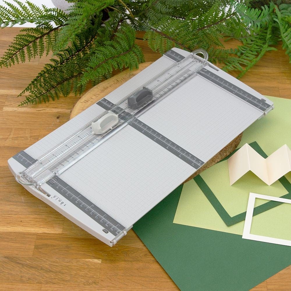 This 12-inch super trimmer is ideal for scrapbooking, photographs, all weights of paper, lightweight card stock, rubber stamping, card making and much more! Anything that needs a crisp clean straight edge! This trimmer features a unique lever for easy paper alignment, English and Metric measurements, 0.25-inch grid lines, two extendable rulers that measure paper up to 12 inches, an accurate measuring grid along the top, middle and end of the trimmer, permanent markings for popular paper sizes and interchangeable blade carrier. Two handy storage slots for easy transport! The Super Trimmer comes with both a scoring and a sharp blade.