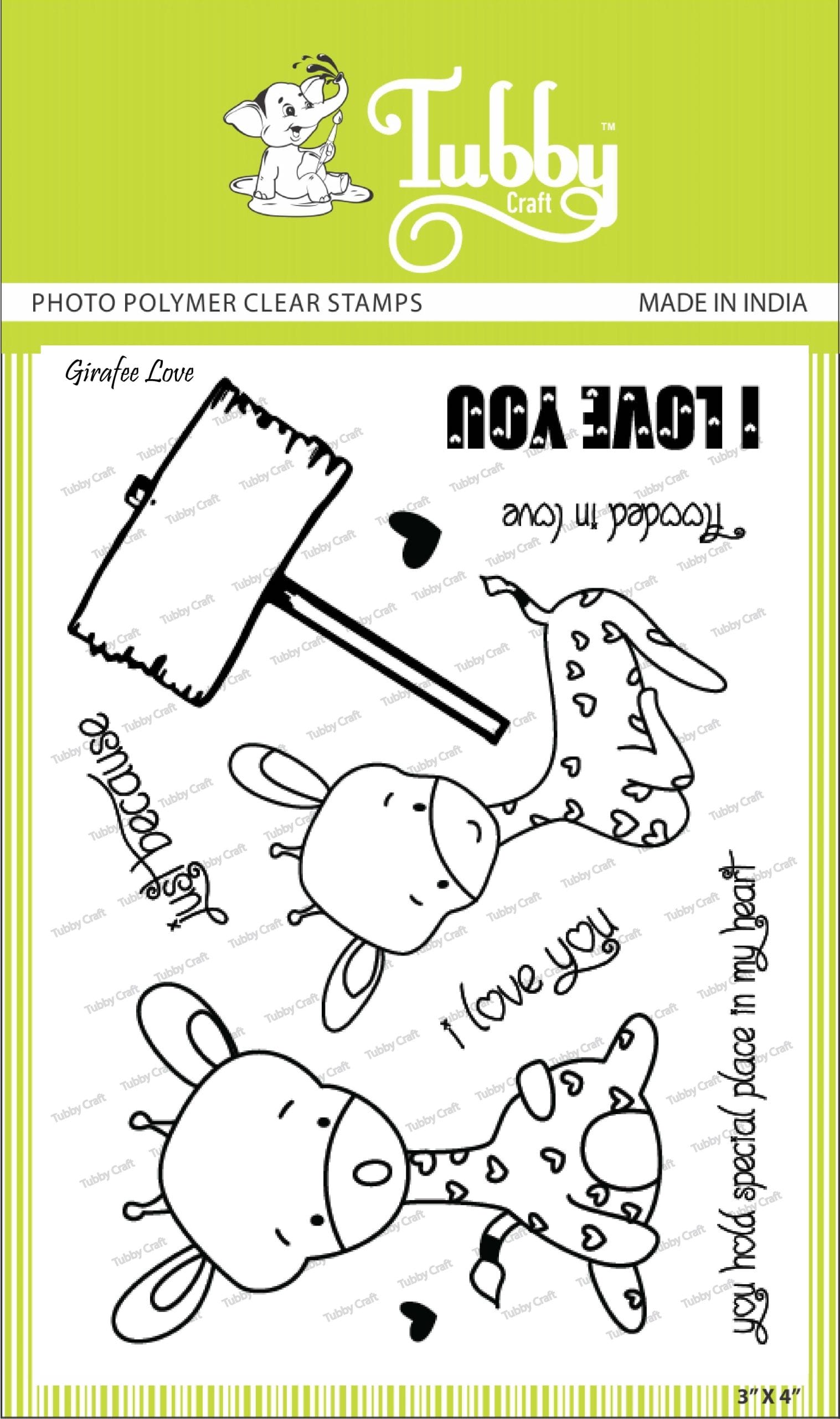Tubby Craft’s photopolymer stamp – Giraffe Love, gives perfect finish each time they are used. Apply to any acrylic block to stamp. This stamp set contains 11 stamps with 4 by 4 backing sheet.